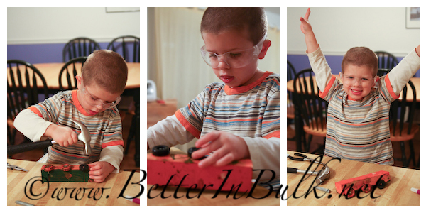 In other news, after taking these pictures, I was convinced once and for all that it was past time for AJ’s haircut. So much better now! You can see what a different half an inch makes in this next series of pictures of AJ making his own pinewood derby car. More pictures from tonight’s actual pinewood derby race will be coming soon! In case you were wondering, AJ did not compete with his 6-wheeled car.